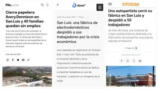 Solo por mencionar los ejemplos más recientes, el 17 de noviembre se supo que la empresa Dana, de Estados Unidos, cerró su planta en Naschel, dejando sin sus fuentes de ingresos a unos 50 trabajadores (y a otros 40 puestos indirectos). El 25 de noviembre, se confirmó que en Villa Mercedes, Koh-i-noor (que fabrica lavarropas, secarropas y heladeras) despidió a 14 personas. A inicios de julio, en la capital puntana, Avery Dennison (que desarrollaba etiquetas para envases) echó a 40 obreros.