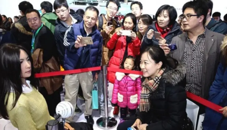 Entre los pasillos del pabellón, un artista vestido con un traje marcial de seda blanca practica taichí con un brazo motorizado, está rodeado de robots con rasgos chinos. Unas máquinas de karaoke sirven bebidas, en medio de una competición desenfrenada por promover los jiqiren, los "hombres máquina" chinos. Los humanoides son la gran atracción de la muestra: en un rincón, Geminoid-F, la actriz robot creada por el japonés Hiroshi Ishiguro se roba todas las selfies.