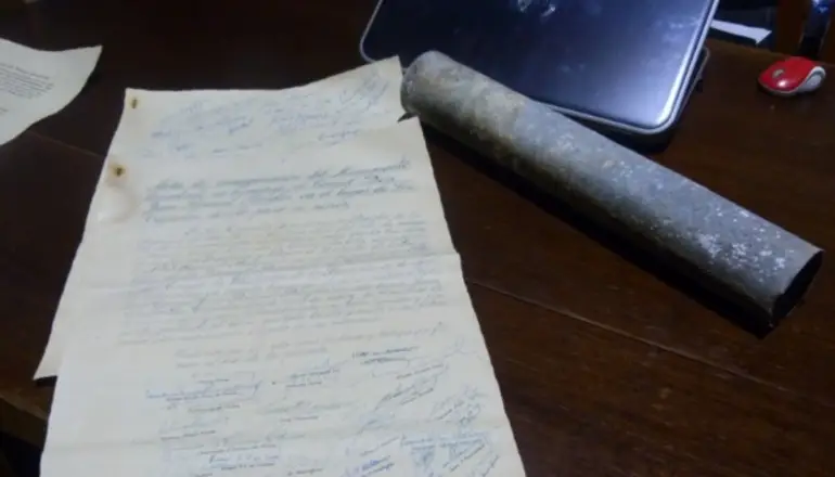 También en el cilindro depositaron la respuesta positiva del Gobierno que encabezaba Ricardo Zavala Ortiz. Vialidad Provincial respondió al llamado y fue la encargada de concretar el anhelo de los vecinos. Y también, como fiel testigo del momento más feliz, en el cilindro estaba el acta que daba cuenta de la inauguración del monolito. La cámara de José La Vía también inmortalizó ese instante.