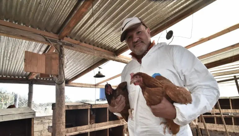 Ángel Luna trabaja bajo un sistema agroecológico denominado “gallinas felices”, en el que las aves se desarrollan en espacios verdes, juegan y se alimentan sin sufrir estrés.
