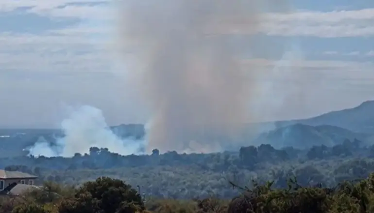 Varias dotaciones de Bomberos Voluntarios de Merlo, Los Molles y de Carpintería trabajan intensamente para apagar el incendio que se desató en las Sierras de los Comechingones en inmediaciones del Monasterio de Belén, en jurisdicción de carpintería.