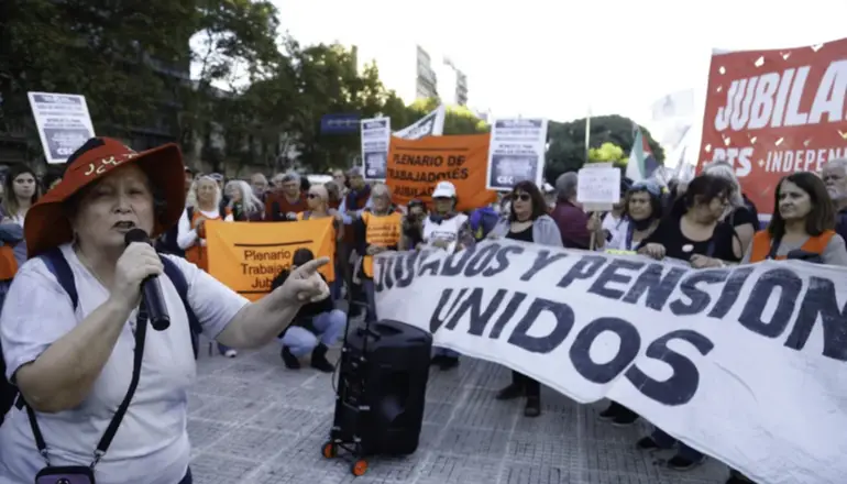 Organizaciones de jubilados, acompañados por centrales sobreras volvieron movilizarse hoy en la Plaza Congreso Congreso en rechazo al ajuste del Gobierno de Javier Milei y contra el veto presidencial a la ley que establecía aumentos para el sector previsional.
