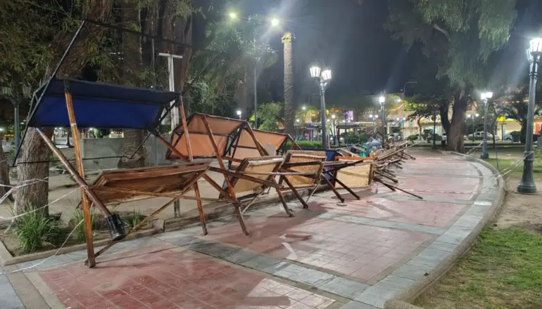 Los puestos de artesanos de la plaza Pringles fueron algunos de los elementos más afectados por el fuerte viento que llegó a la provincia el viernes por la tarde y que posiblemente se mantenga durante todo el fin de semana.