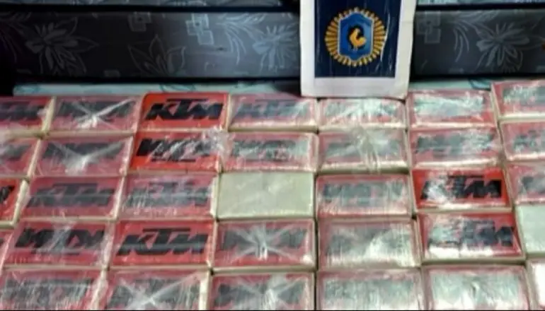 El cargamento de cocaína, fraccionada en paquetes con la marca KTM, fue hallada en ocho allanamientos simultáneos, que también arrojó la detención de 5 personas, un de nacionalidad peruana, un segundo uruguayo y tres argentinos.
