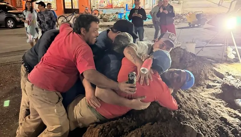 Los empleados municipales celebraron, exhaustos, que el pueblo tenga agua nuevamente luego de varios días de corte. Hubo abrazos y alegría entre los trabajadores por el trabajo cumplido.