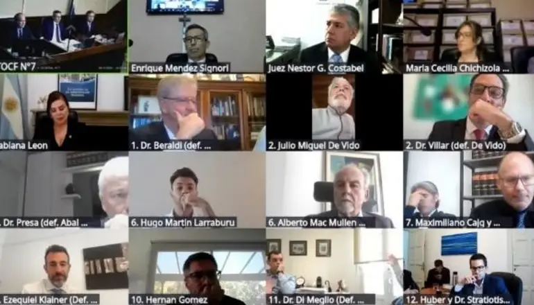 Los jueces Méndez Signori, Fernando Canero y Germán Castelli se conectaron desde una sala de audiencias del Palacio de Justicia en Talcahuano 550, donde ese tribunal tiene su sede y donde minutos antes permitieron el acceso de reporteros gráficos para tomar imágenes.