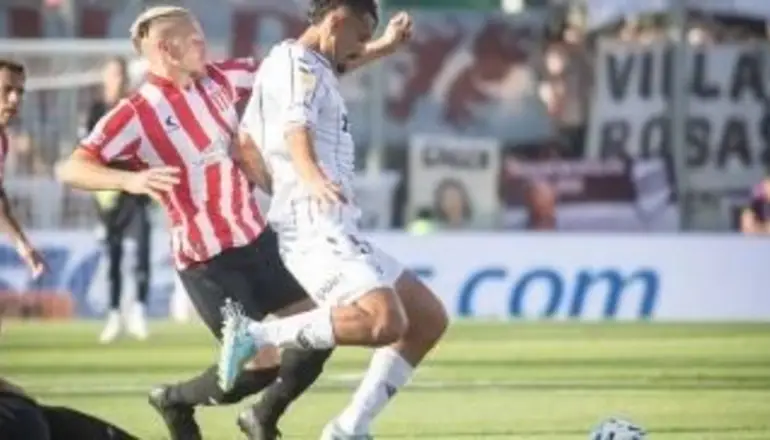 Santiago Ascacibar disputa la pelota con Ignacio Vázquez. Foto: Agencia NA (@caplatense)