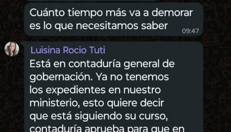 “Buenos días, emprendedores. Pedimos mil disculpas por estas demoras. Los inconvenientes se generaron porque faltaban algunas constancias de CBU que se están resolviendo en este momento. Nuestra intención jamás fue que el pago se demorara, pero los requerimientos administrativos deben cumplirse a rajatabla; de lo contrario, los depósitos no se pueden realizar. Entendemos la necesidad de cada uno/a de ustedes de recibir el dinero, ya que hicieron una inversión muy grande. Nos faltan dos constancias por enviar y ya quedará todo en condiciones para que Tesorería de Gobernación genere el pago. No sabría decirles exactamente cuándo lo realizarán, porque eso ya corresponde a Gobernación. Cualquier novedad los mantengo al tanto. Utilizo el grupo para responderles a todos, ya que recibí muchos mensajes y además estoy abocada al evento del domingo”.