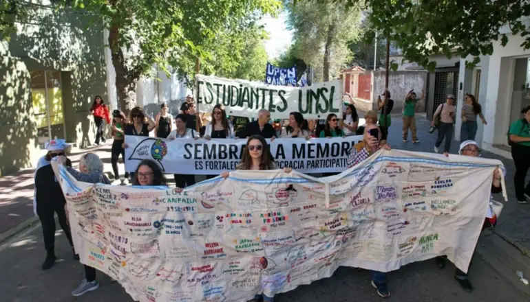 Tras el acto central en la explanada de UNSL, se realizó la marcha por las calles de la ciudad que terminó en la plaza Pringles con consignas contra el negacionismo, el gobierno nacional, la Iglesia y la administración de Claudio Poggi.