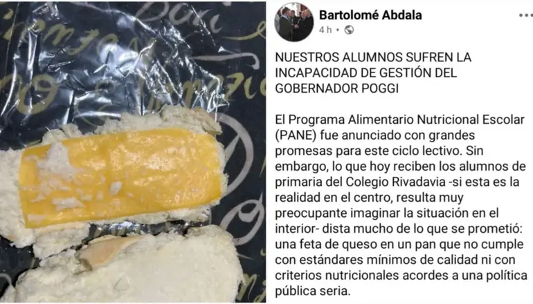 El escenario político de San Luis suma un nuevo capítulo de conflicto tras las declaraciones del senador nacional, Bartolomé Abdala, quien advirtió en sus redes sociales que el Programa Alimentario Nutricional Escolar (PANE) está lejos de cumplir con las promesas realizadas para el actual ciclo lectivo.