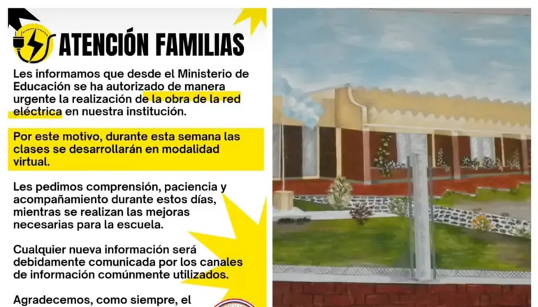 “Les informamos que desde el Ministerio de Educación se han autorizado de manera urgente la realización de la obra de la red eléctrica en nuestra institución”, indica entre otros conceptos la disposición que fue comunicada a los padres.