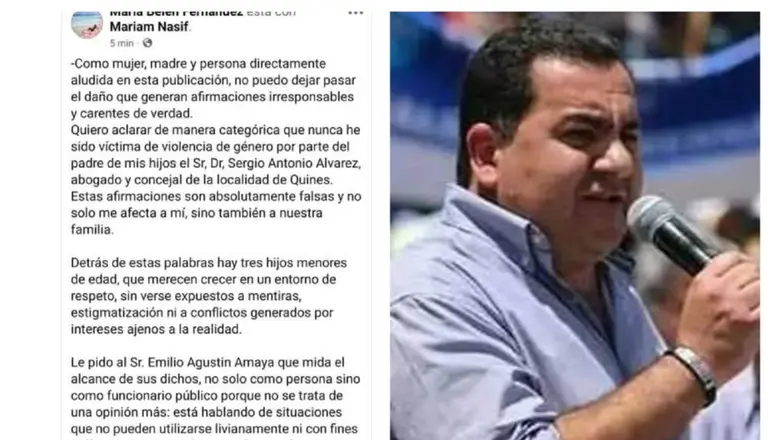 Para cortar de raíz con la mentira, María Belén Fernández salió al cruce de esas publicaciones: “Como mujer, madre y persona directamente aludida en esta publicación, no puedo dejar pasar el daño que generan estas afirmaciones irresponsables y carentes de verdad. Quiero aclarar de manera categórica que nunca he sido víctima de violencia de género por parte del padre de mis hijos, Dr. Sergio Antonio Álvarez, abogado y concejal de Quines. Esas afirmaciones son absolutamente falsas y no solo me afecta a mí, sino también a nuestra familia”, señaló entre otros conceptos en uno de los artículos.