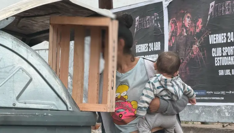 La familia rodea el contenedor y para hacer más fácil la tarea del hombre colocó un cajón de manzanas como traba de la puerta. Una nena en el chocecito llora porque reclama atención pero también porque tiene hambre y el bebé en los brazos de su madre mira la suciedad del fondo del contenedor, acaso, como metáfora de su futuro.