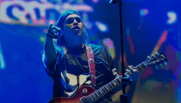 A las 21:30 Guido Sardeli se subió a una de las cajas de sonido del escenario y dio inicio a un concierto que fue mucho más que eso. A los pocos segundos, los primeros fuegos de artificio volaron desde el techo del escenario hacia el nublado cielo puntano.